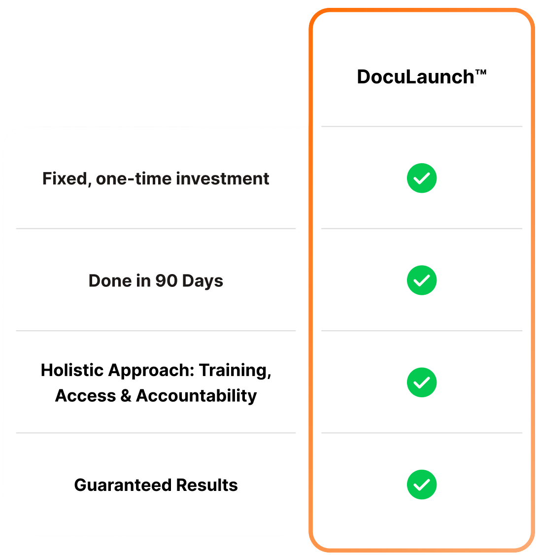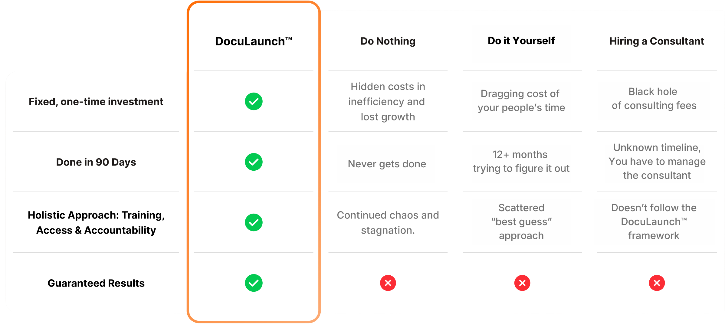 Our 90-day DocuLaunch™ system finally gets your processes documented, standardized, and implemented — the work your team has been putting off for years. We do it for you so you can scale with confidence.